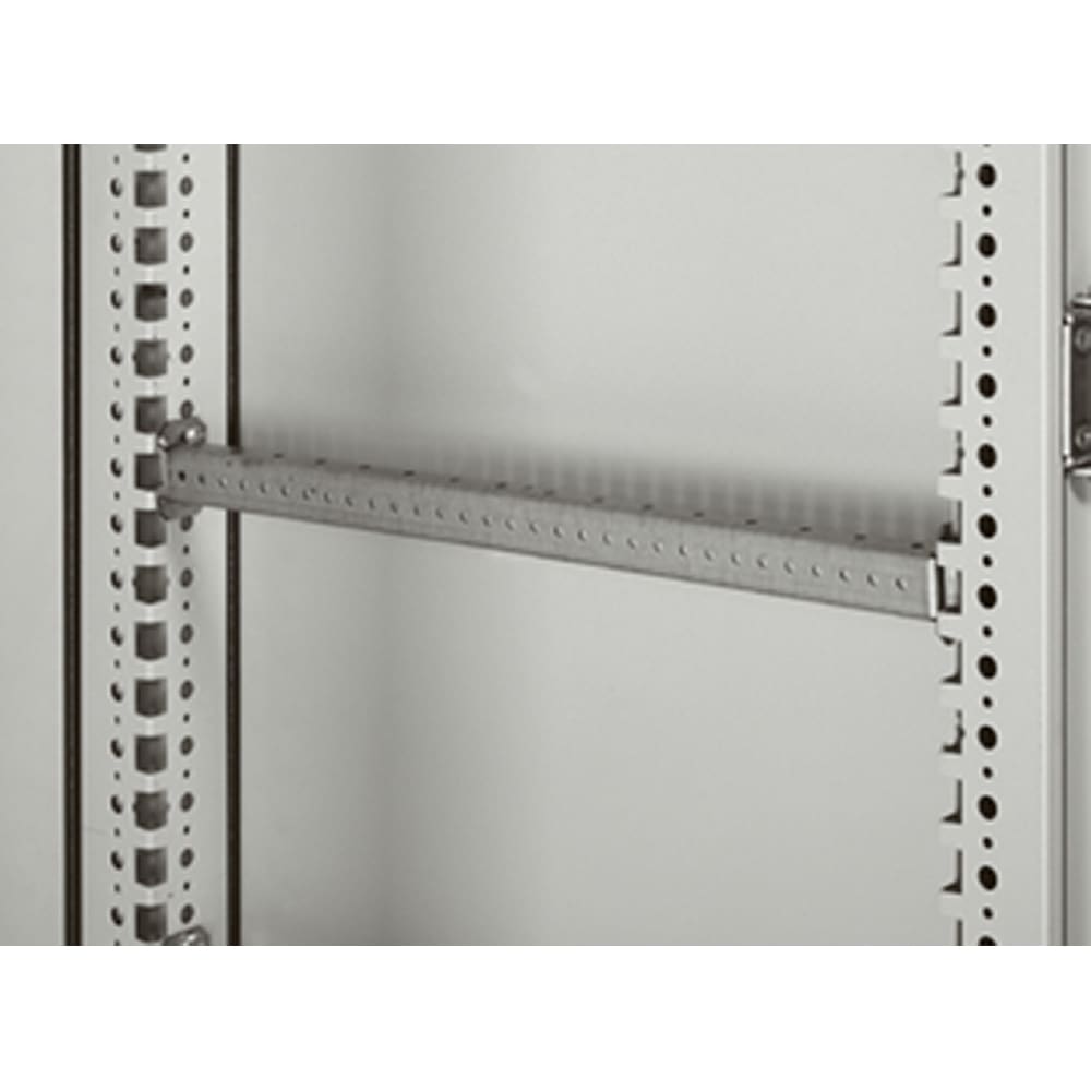 Traversa semplice 1000 mm orizzontale. Permettono la realizzazione di telai parziali all’interno degli armadi. Preposizionamento provvisorio prima del fissaggio definitivo mediante viti. Forature con passo 25mm predisposte per dadi in gabbia. In acciaio galvanizzato. Possono essere montanti sia in larghezza che in profondità o altezza.