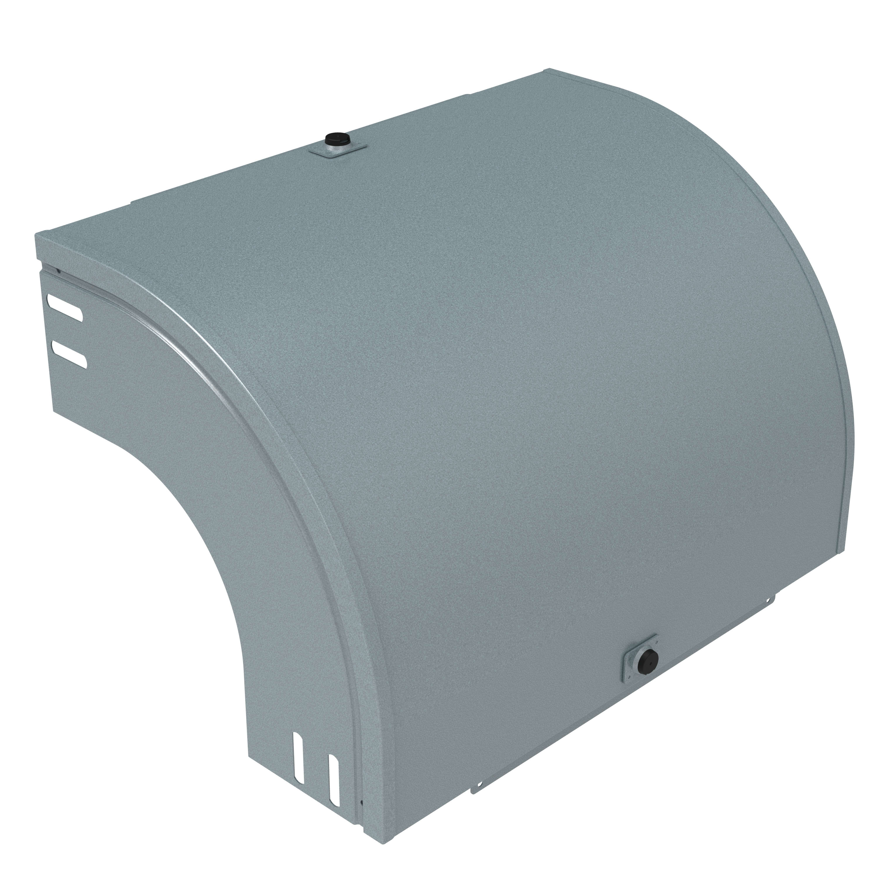Curva in discesa a 90 completa di coperchio. Altezza: 100 mm. Larghezza: 500 mm. Finitura Z: Acciaio zincato sendzimir.