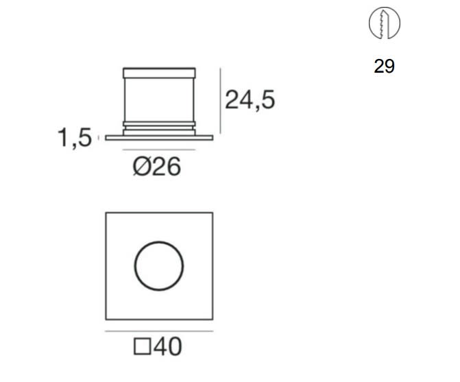 Downlights a singola emissione per applicazione indoor. La sorgente luminosa LED, di colore bianco freddo, con distribuzione luminosa 70°, è composta da 1 LED powerled, con una CCT 5000 K ed un CRI 80; il flusso luminoso della sorgente è di 158 lm, con un'efficienza nominale di 158.0 lm/W. Il corpo dell'apparecchio, realizzato in ottone, presenta una finitura di colore cromo, ottenuta tramite galvanostegia. Il grado di protezione è IP44; il peso complessivo è di 0.060 kg. Il driver d’alimentazione non è fornito e deve essere ordinato separatamente. La potenza assorbita dall'apparecchio è di 1,0 W. Il cavo per l'alimentazione è incluso e presenta.L'apparecchio presenta una classe di isolamento III ed è installabile a parete o soffitto, con foro tondo didiametro 29 mm (nel cartongesso) su muratura con controcassa cod. 84915.