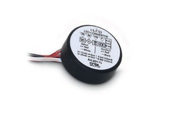 ROUND 12W 24V DC/12V DC Converter (1-6 LEDs 24V DC/ 1-2 LEDs 12V DC) 630mA. Protezione contro le sovratemperature, il sovraccarico, il circuito aperto ed il cortocircuito lungo la linea in uscita.