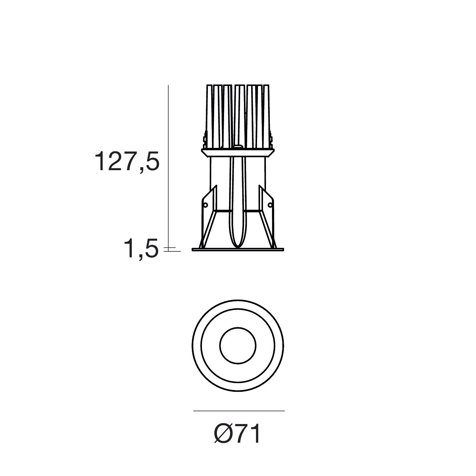 Downlights a singola emissione per applicazione indoor. La sorgente luminosa LED, di colore bianco caldo, con distribuzione luminosa Flood, è composta da 1 LED powerled, con una CCT 3000 K ed un CRI 80; il flusso luminoso della sorgente è di 1194 lm, con un'efficienza nominale di 119.4 lm/W.