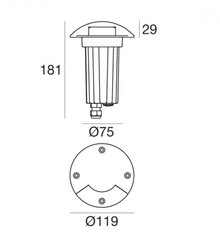 Uplights a singola emissione per applicazione outdoor. La sorgente luminosa LED, di colore bianco caldo, con distribuzione luminosa Radial, è composta da 1 LED arrayled, con una CCT 3000 K ed un CRI 80; il flusso luminoso della sorgente è di 685 lm, con un'efficienza nominale di 114.2 lm/W.