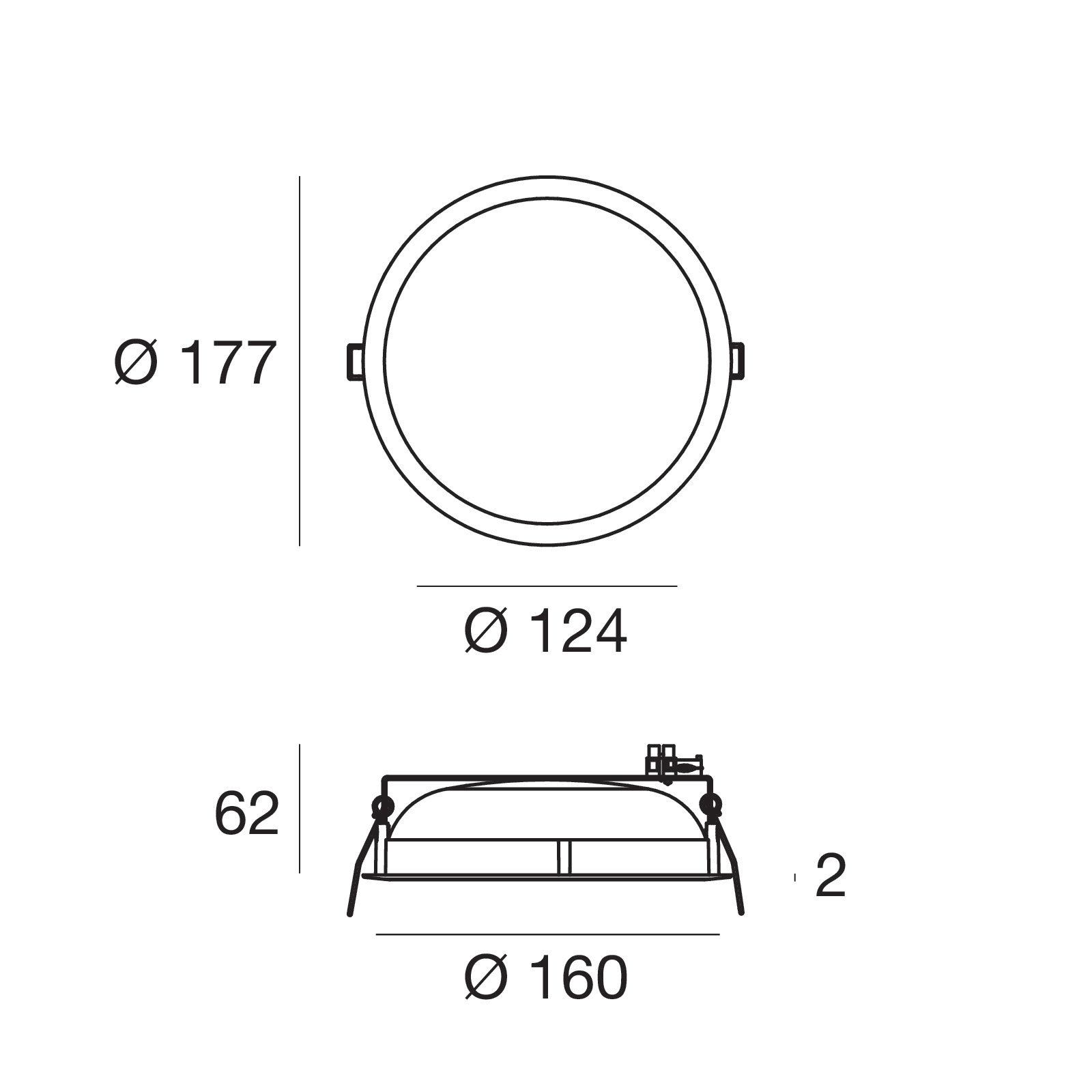 L'apparecchio presenta una classe di isolamento III ed è installabile a soffitto, con foro tondo di diametro 169 mm (nel cartongesso).
