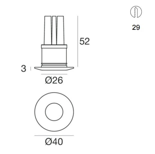 Downlights a singola emissione per applicazione indoor. La sorgente luminosa LED, di colore bianco caldo, con distribuzione luminosa 30°, è composta da 1 LED powerled, con una CCT 3000 K ed un CRI 80; il flusso luminoso della sorgente è di 208 lm, con un'efficienza nominale di 104.0 lm/W. Il corpo dell'apparecchio, realizzato in ottone, presenta una finitura di colore cromo, ottenuta tramite galvanostegia. Il grado di protezione è IP40; il peso complessivo è di 0.066 kg. Il driver d’alimentazione non è fornito e deve essere ordinato separatamente. La potenza assorbita dall'apparecchio è di 2,0 W. Il cavo per l'alimentazione è incluso e presenta. L'apparecchio presenta una classe di isolamento III ed è installabile a parete o soffitto, con foro tondo di diametro 29 mm (nel cartongesso) su muratura con controcassa cod. 84901.