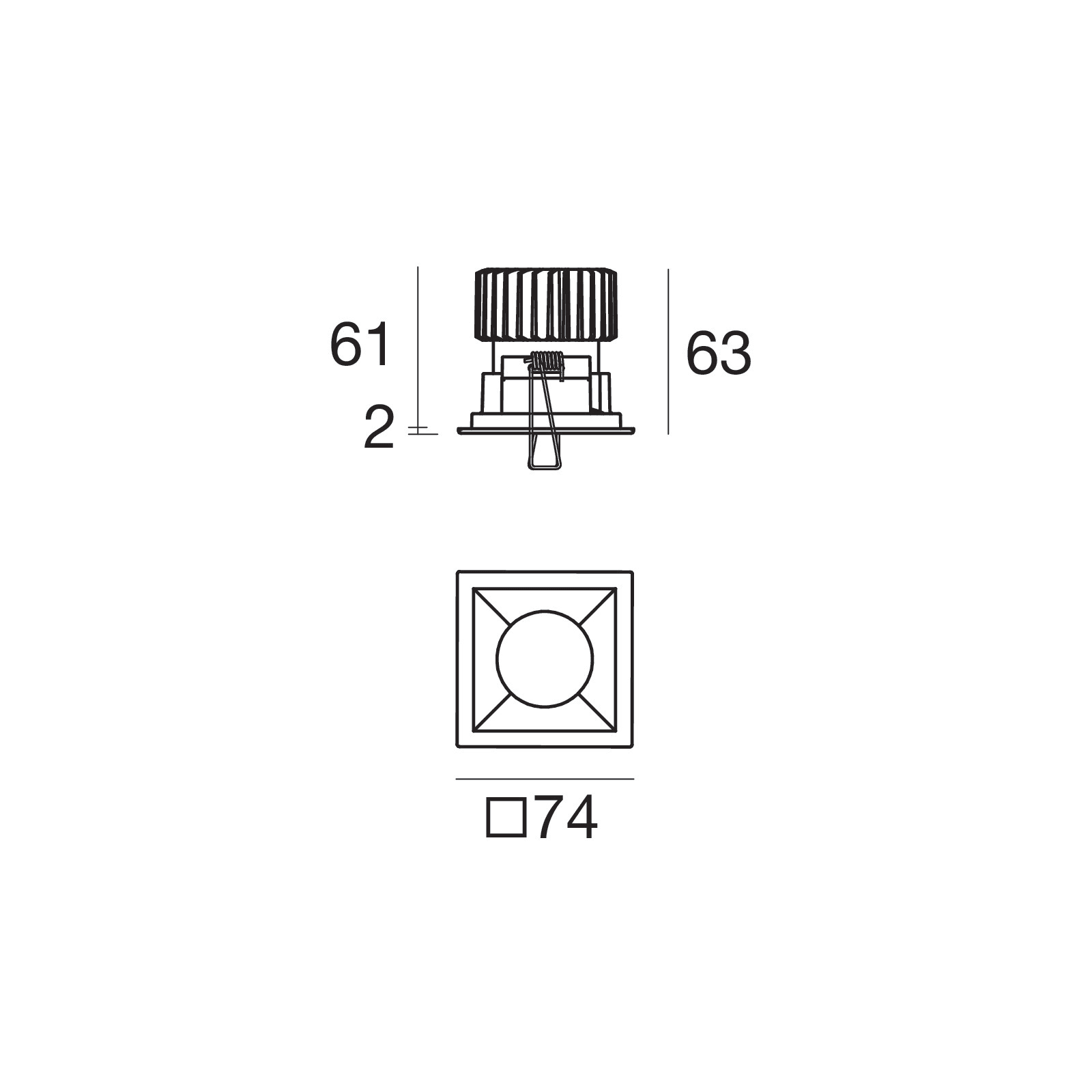 Downlights a singola emissione per applicazione indoor. La sorgente luminosa LED, di colore bianco caldo, con distribuzione luminosa Wide Flood, è composta da 1 LED arrayled, con una CCT 3000 K ed un CRI 80; il flusso luminoso della sorgente è di 770 lm, con un'efficienza nominale di 118.5 lm/W.