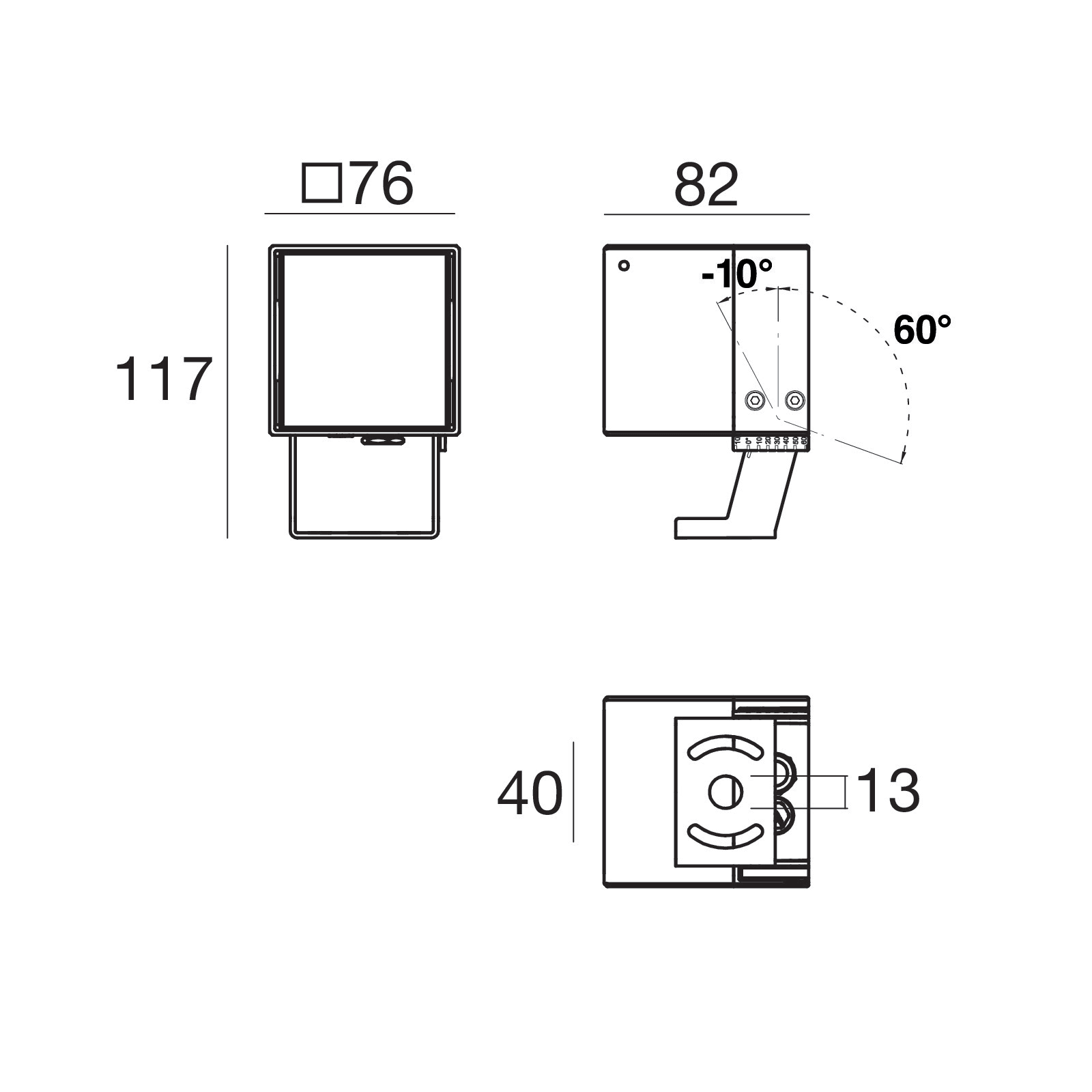 Proiettori a singola emissione per applicazione outdoor. La sorgente luminosa LED, di colore super caldo, con distribuzione luminosa spot, è composta da 1 LED arrayled, con una CCT 2700 K ed un CRI 80; il flusso luminoso della sorgente è di 770 lm, con un'efficienza nominale di 118.5 lm/W. Il corpo dell'apparecchio, realizzato in alluminio pressofuso en ab - 46100, presenta una finitura di colore grigio ral 9006 goffrato, ottenuta tramite anodizzazione poro aperto + verniciatura a polvere; il diffusore èprodotto in vetro extra chiaro - temprato, con una lavorazione di serigrafia. Il grado di protezione è IP66; il peso complessivo è di 0.25 kg. La potenza assorbita dall'apparecchio è di 6.5 W.