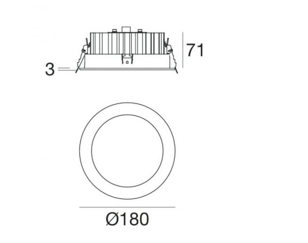 Downlights a singola emissione per applicazione indoor. La sorgente luminosa LED, di colore bianco caldo, con distribuzione luminosa General Lighting, è composta da 84 LED topled, con una CCT 3000 K ed un CRI 80; il flusso luminoso della sorgente è di2604 lm, con un'efficienza nominale di 113.2 lm/W.