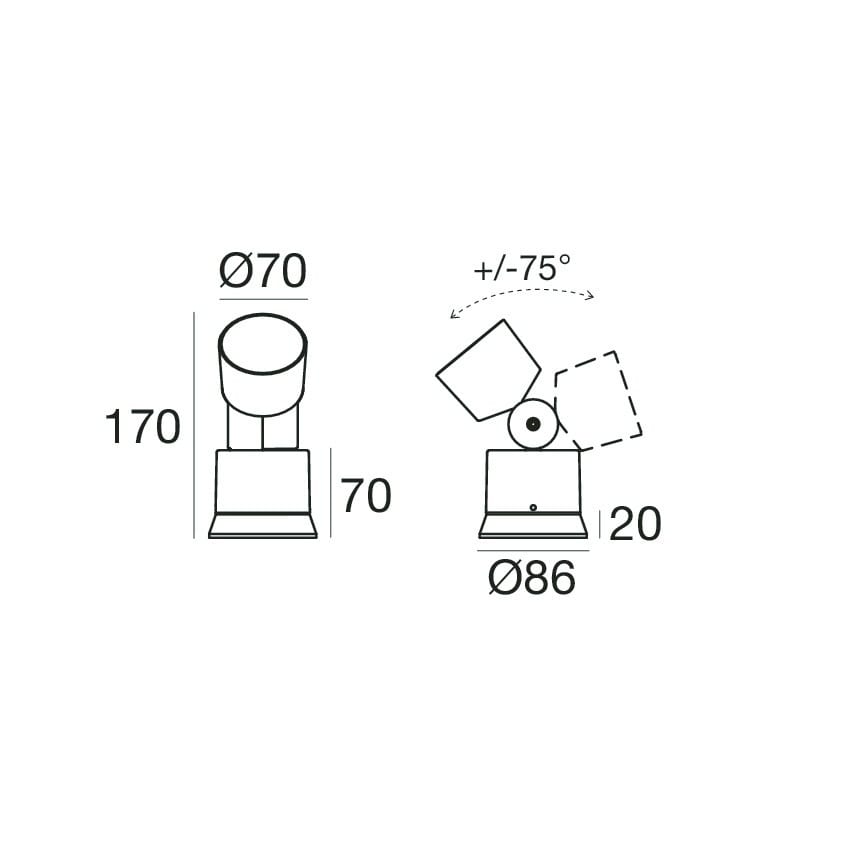 Proiettori a singola emissione per applicazione outdoor. La sorgente luminosa LED, di colore bianco naturale, con distribuzione luminosa Spot, è composta da 1 LED arrayled, con una CCT 4000 K ed un CRI 80; il flusso luminoso della sorgente è di 1022 lm, con un'efficienza nominale di 127.8 lm/W. Il corpo dell'apparecchio, realizzato in alluminio, presenta una finitura di colore bianco ral 9003 goffrato, ottenuta tramite verniciatura. Il grado di protezione è IP65; il peso complessivo è di 0,560 kg. Il driver dialimentazione è incluso nella confezione. La potenza assorbita dall'apparecchio è di 8 W, e viene fornita da un driver specifico con range operativo 180V - 300V / 50Hz - 60Hz. L'apparecchio presenta una classe di isolamento II ed è installabile aparete, soffitto o pavimento.