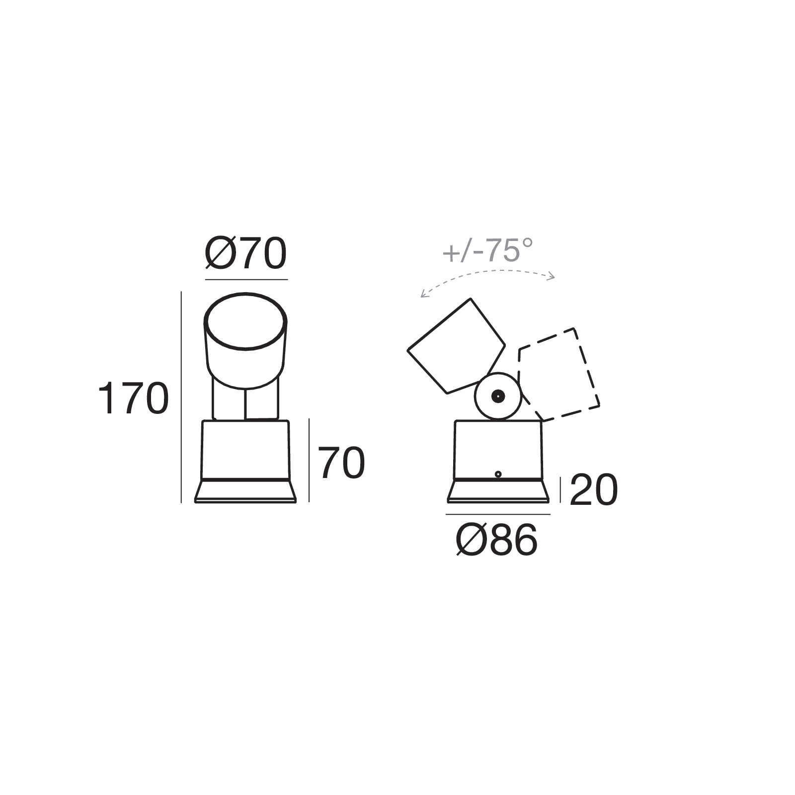 Proiettori a singola emissione per applicazione outdoor. La sorgente luminosa LED, di colore bianco caldo, con distribuzione luminosa Medium Flood, è composta da 1 LED arrayled, con una CCT 3000 K ed un CRI 80; il flusso luminoso della sorgente è di 1088lm, con un'efficienza nominale di 136.0 lm/W. Il corpo dell'apparecchio, realizzato in alluminio pressofuso en ab - 46100, presenta una finitura di colore grigio ral 9006 goffrato, ottenuta tramite anodizzazione poro aperto + verniciatura a polvere; il diffusore è prodotto in vetro extra chiaro - temprato, con una lavorazione di serigrafia. Il grado di protezione è IP65; il peso complessivo è di 0.560 kg. La potenza assorbita dall'apparecchio è di 8 W. L'apparecchio presenta una classe di isolamento II ed è installabile a parete, soffitto o pavimento. Conforme alla norma EN 60598-1 e alle relative prescrizioni particolari.