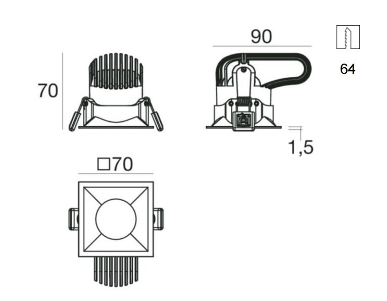 L'apparecchio presenta una classe di isolamento III ed è installabile a soffitto, con foro quadrato con misura 64 x 64 mm (nel cartongesso).