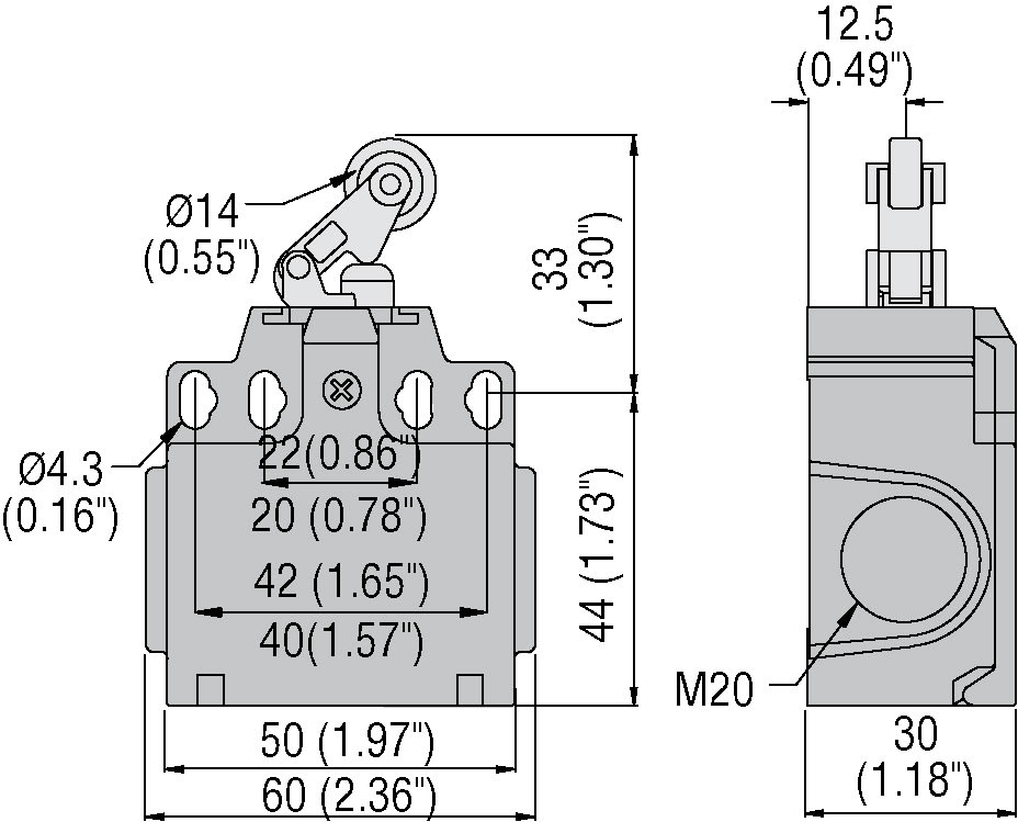 FINECORSA SERIE K, A LEVA CON ROTELLA CENTRALE, 2 INGRESSI LATERALI PER CAVI. DIMENSIONI COMPATIBILI EN 50047, CUSTODIA METALLICA, CONTATTI 1NA+1NC A SCATTO. ROTELLA IN METALLO