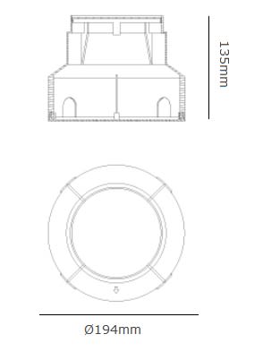 Controcassa a murare per apparecchi serie Lira 140, Corpo in tecnopolimero, Chiusura inferiore e superiore per agevolare la cementazione, Controcassa cilindrica di dimensioni Ø194mm con profondità 135mm.