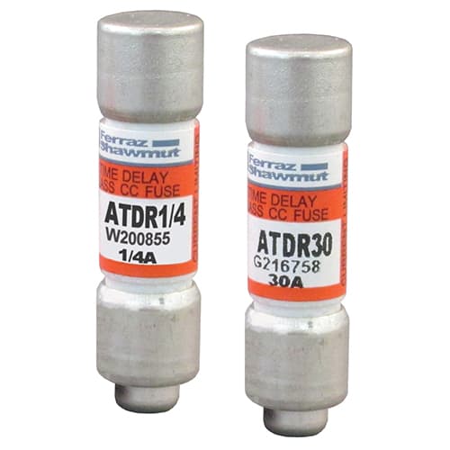 FUSIBILI UL / CSA A BASSA TENSIONE Classe CC ATDR - Classe CC - Ritardo di tempo Amp-Trap 2000 tempi di ritardo I fusibili a dimensione ATDR forniscono protezione IEC Type 2 "non danneggiata"ai componenti del circuito di derivazione e ai piccoli motori sempre più sensibili della vostra struttura - riducendo al minimo il rischio di danni causati da errori. I fusibili CC di classe ATDR offrono le migliori caratteristiche di ritardo di tempo nella loro classe con un'eccellente capacità ciclica perpiccoli carichi motore.