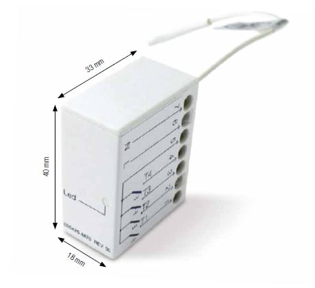 Trasmettitore da incasso con alimentazione a batteria a lunga durata3 Vdc; pila al litio tipo CR2032, 4 canali. Ideale per il comando di automazioni non raggiungibili direttamente via cavo. Frequenza 433,92 MHz, con codifica rolling code a 52 bit (oltre 4,5 milioni di miliardi di combinazioni). Possibilità di collegare fino a 4 pulsanti (opzionali) per la gestione via cavo delle automazioni.