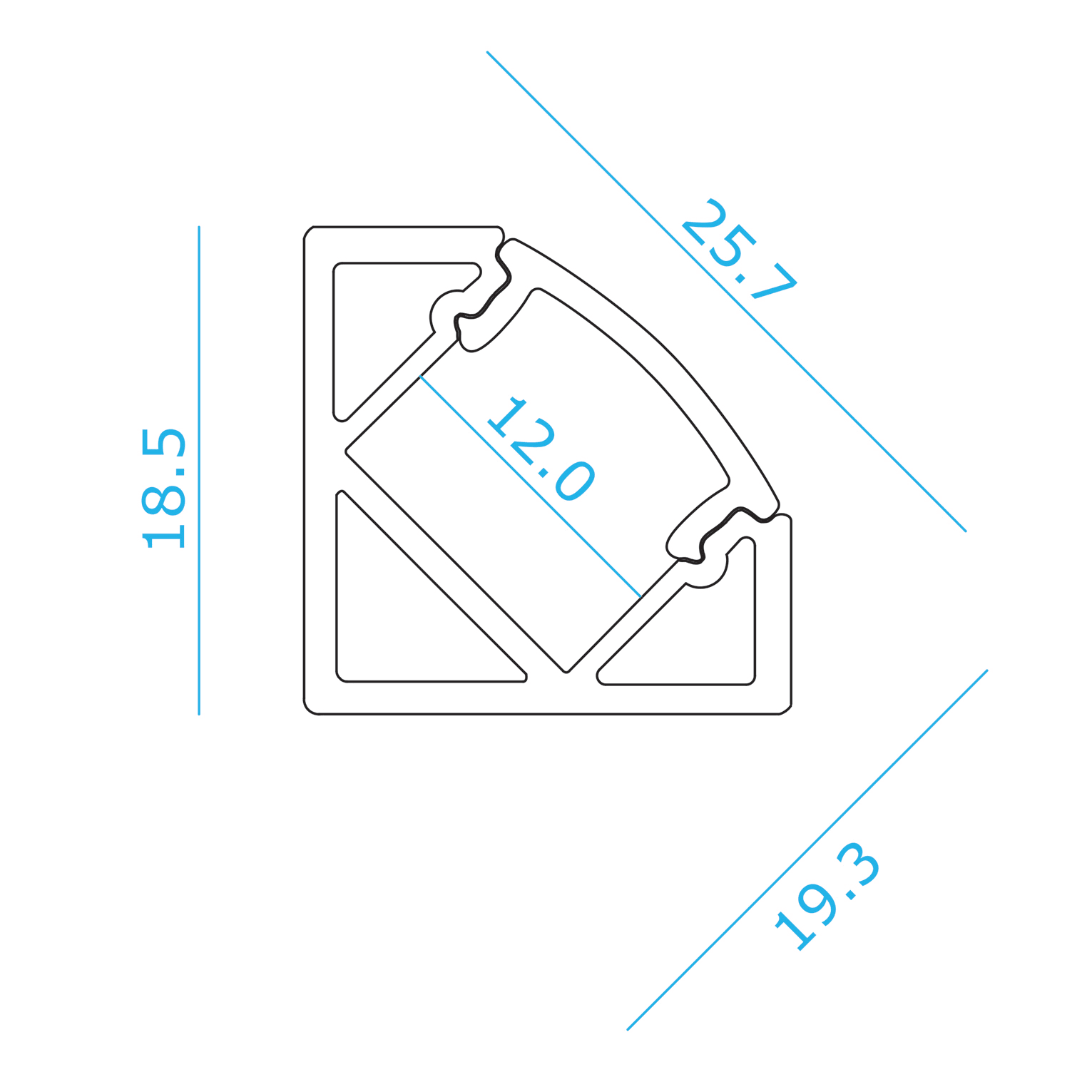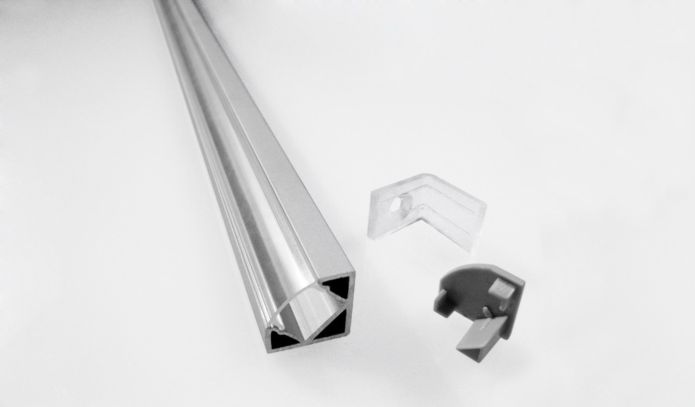 BARRA/STRIP/6/SW - Profilo in alluminio verniciato bianco angolare per striscia LED con diffusore opale di 2m. Emissione luce a 45°. Tappi (4 pz) e clip di fissaggio (4 pz) inclusi.