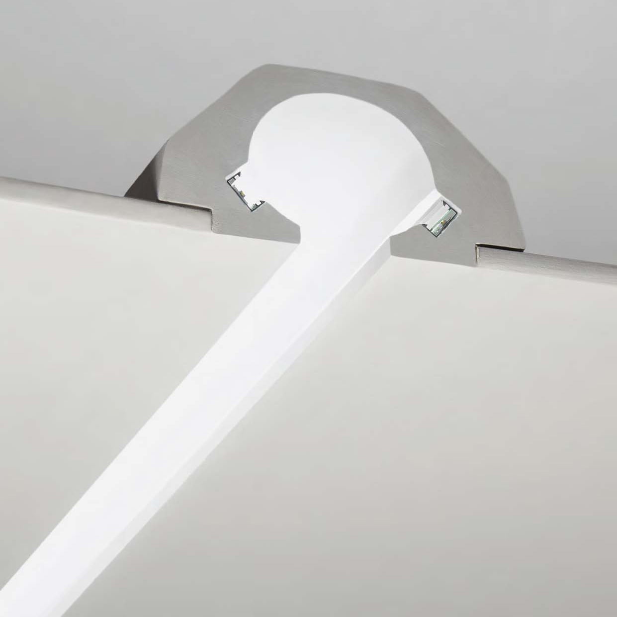 Incasso a soffitto o a parete per installazione in controsoffitti di cartongesso di spessore 13mm. Profilo prefinito in gesso completo di due barre di alluminio per l’installazione di due strisce LED. Chiusure laterali da effettuare durante il montaggio.
