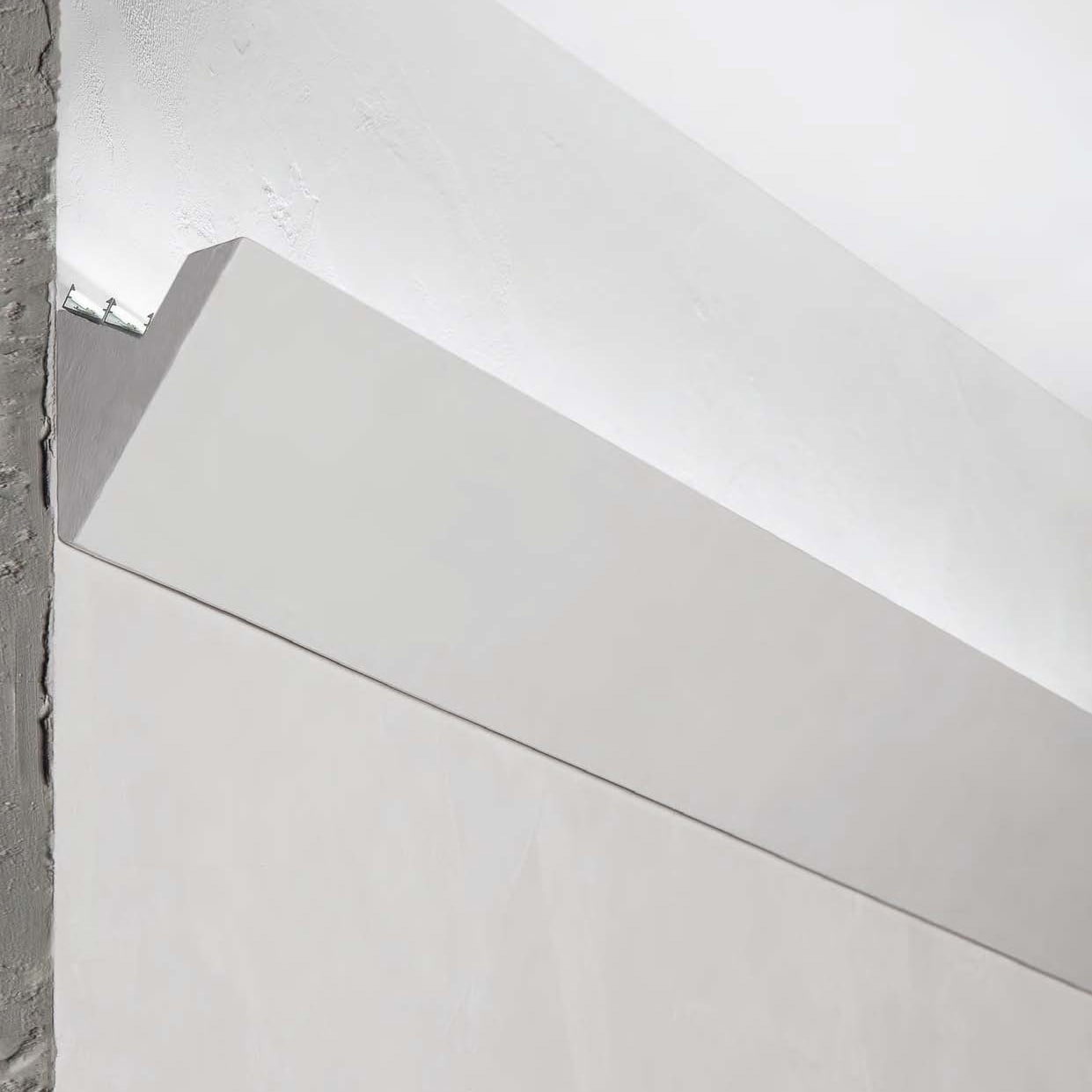 Profilo prefinito in gesso, per installazione a parete, effetto mono-emissione. Elemento completo di due barre in alluminio per applicare fino a due strisce LED. Chiusure laterali da effettuare durante il montaggio.