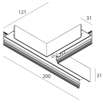 P-30 STRIP LED: GIUNTO a T kit di giunzione incluso. Prevedere 200 mm + 100 mm di strip LED Schermi opali e profili di chiusura da ordinare a parte.