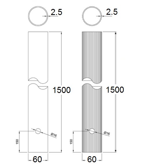 Pali per illuminazione Serie PLV/60-169. Resina poliestere rinforzata con fibra di vetro (Vetroresina) di qualsiasi colore, colori standard Grigio o Nero. La palina per illuminazione, di forma cilindrica è costituita da vetroresina e viene realizzata mediante la tecnica della poltrusione. Le caratteristiche dei materiali utilizzati, la moderna tecnologia di produzione e la sua forma, gli conferiscono infatti elevate prestazioni meccaniche, elevato isolamento elettrico, elevata resistenza alla corrosione ed un ottimo impatto ambientale. Le paline sono a marchio CE, sono disponibili di qualsiasi altezza, colore, rigate. Altezza (H)(mm): 1500. Diametro (D) (mm): 60. Interramento(mm): 380.