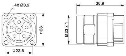 Connettore per apparecchi anteriore, formato sottile diritto, Bloccaggio a vite, M23, numero poli: 5+PE, tipo contatti: Maschio, Attacco a crimpare, O-ring assiale, 4x Ø 3,2, schermata: sì, misura flangia: 28 mm x 28 mm, diametro cavi: 0 mm ... 0 mm