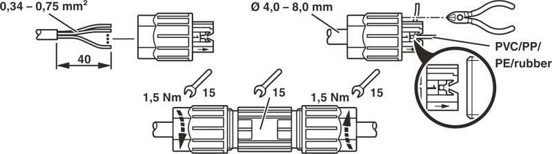 Innovativo e rapido: connessione rapida QUICKON per un risparmio di tempo fino all'80 % durante la connessione in loco. Pratico: confezionamento semplice e rapido senza utensili speciali. Estremamente robusto: custodia con gradi di protezione IP68/IP69K e IK07 per un ampio range di impiego. Connessione sicura grazie alla polarizzazione contro le inserzioni errate e la protezione antinfortunistica a norma DIN EN 0105. Semplice e sicuro: il connettore per linee consente di riparare o prolungare rapidamentele linee, in combinazione con il connettore anche come collegamento per giunti.
