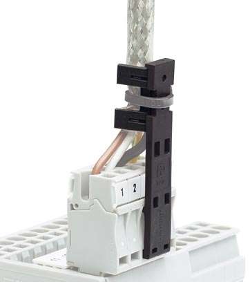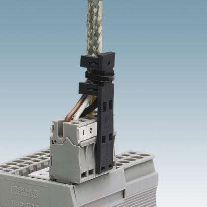 Viene inserito in un fermacavo dopo il cablaggio della spina. Il cavo di connessione della schermatura viene connesso mediante una spina e collegato direttamente al morsetto mediante innesto. Per il collegamento di linee schermate.