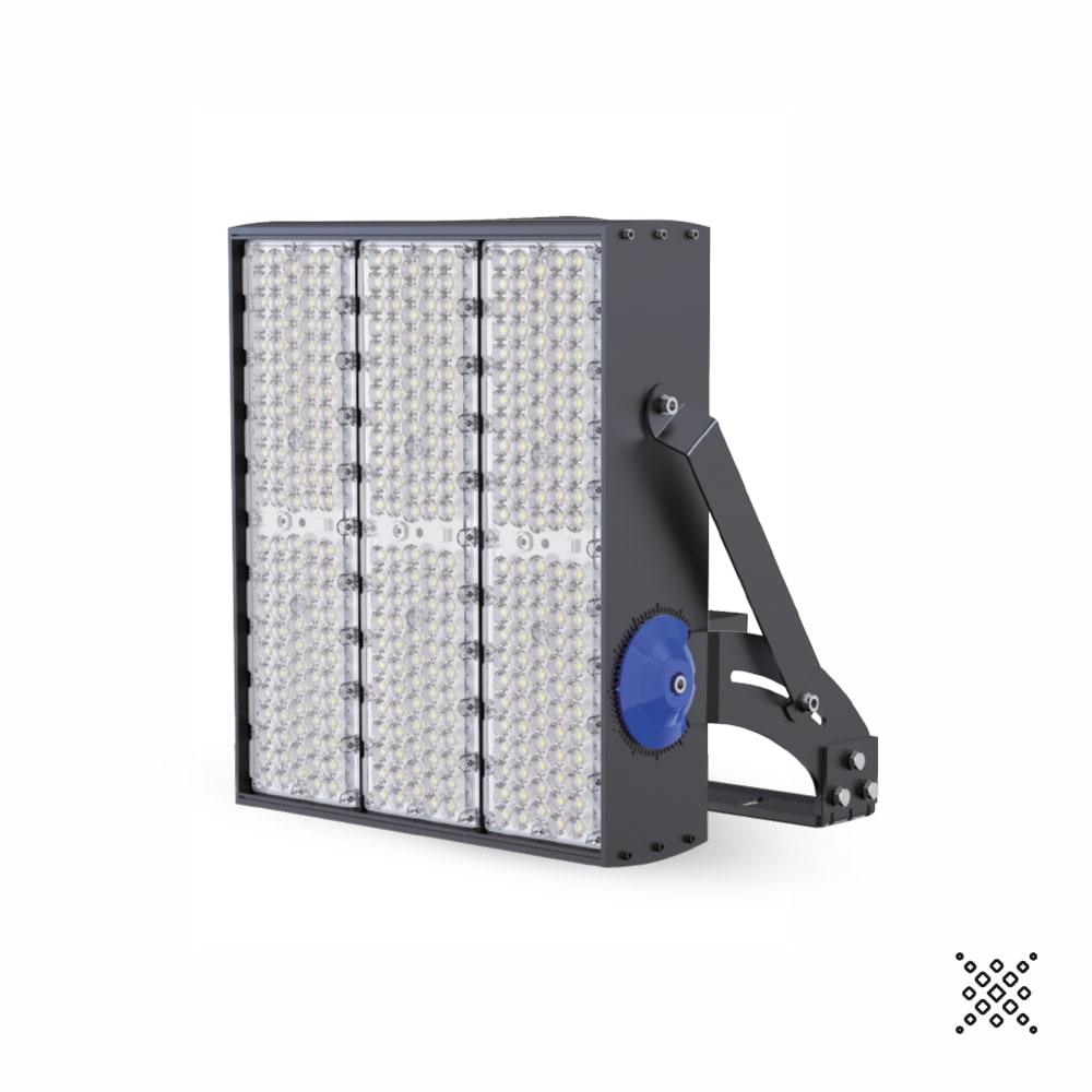 PROIETTORE DA ESTERNO AD ALTE PRESTAZIONI CON SISTEMA OTTICO MULTICHIP PER MIGLIORARE LA DISTRIBUZIONE DELLA LUCE E GARANTIRE UNA ELEVATA EFFICENZA E AFFIDABILITÀ, CORPO CON RESISTENZA AERODINAMICA MIGLIORATA, PASSIVATO E VERNICIATO CON VERNICI EPOSSIDICHE AD ALTA RESISTENZA, BULLONERIA IN ACCIAO INOX E SISTEMA GONIOMETRICO PER UNA PRECISA REGOLAZIONE DEL FASCIO DI LUCE