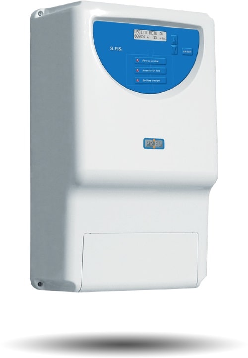 S.P.S. 3 - Centrale di soccorso. • Gestione a doppio microprocessore multilingua • Display multifunzioni (tensione rete, batteria, corrente di ricarica, potenza erogata, storico e altre funzioni) • Segnalazione acustica e ottica overload • Controllo amperometrico intelligente a riarmo automatico • Autotest manuale • Funzione ECO-MODE in presenza del kit fotovoltaico.