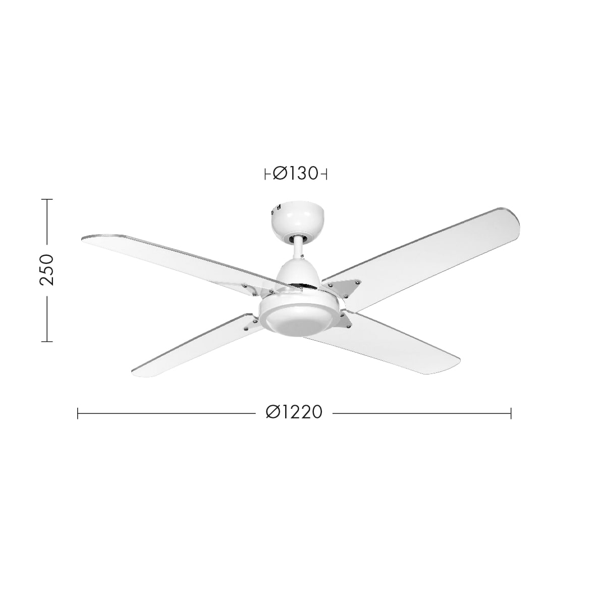 Ventilatore a soffitto a due, tre e quattro pale in metallo cromato per la versione con struttura cromo, in acrilico trasparente per la versione con struttura bianca. Con regolatore a parete e invertitore di marcia estate-inverno. Non dotato di illum inazione.