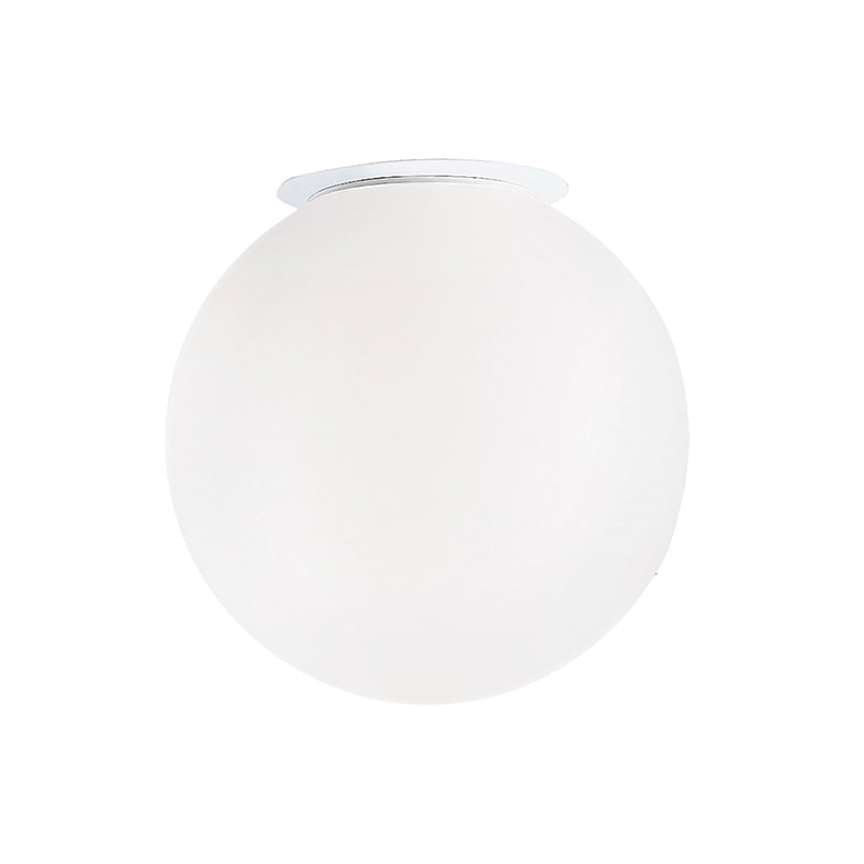 Lampada da soffitto o da parete, a sospensione, da tavolo e da terra con diffusore tondo in vetro so ffiato satinato, per un?ottima propagazione dellaluce. Disponibile in diversi diametri. Nella soluzione sospesa viene proposta in versione singola con rosone bianco, o in caduta multipla a tre elementi con kit di decentramento in finitura cromo. Per la versione da soffitto, a sospensione e tavolodisponibile con LED integrato (2700K) o con attacco E14 e E27 che consentono di montare lampadina LED. La piantana con treppiede in finitura bianca op aco ? proposta nella versione E27.