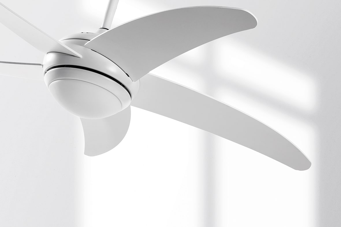 Ventilatore a soffitto a LED con CCT settabile per selezionare la temperatura colore preferito. Cinque pale in legno verniciato grigio o bianco e struttura in alluminio grigio o bianco. Dotato di telecomando a onde radio per la regolazione della velocit?, invertitore di marcia estate-inverno e accen sionespegnimento della luce.