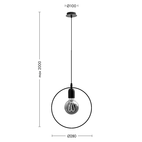 Lampada a soffitto e a sospensione con struttura dalla forma circolare in metallo, disponibile in finitura cromata, bianca e nera opaca. Nella versione a sospensione il rosone ? in tinta con la struttura, il cavo di sospensione ? trasparente per la v ersione cromo e in tinta per le finiture bianca enera.Attacco E27 che consente di personalizzare ulteriormente il prodotto montando una lampadina a v ista a LED a scelta.