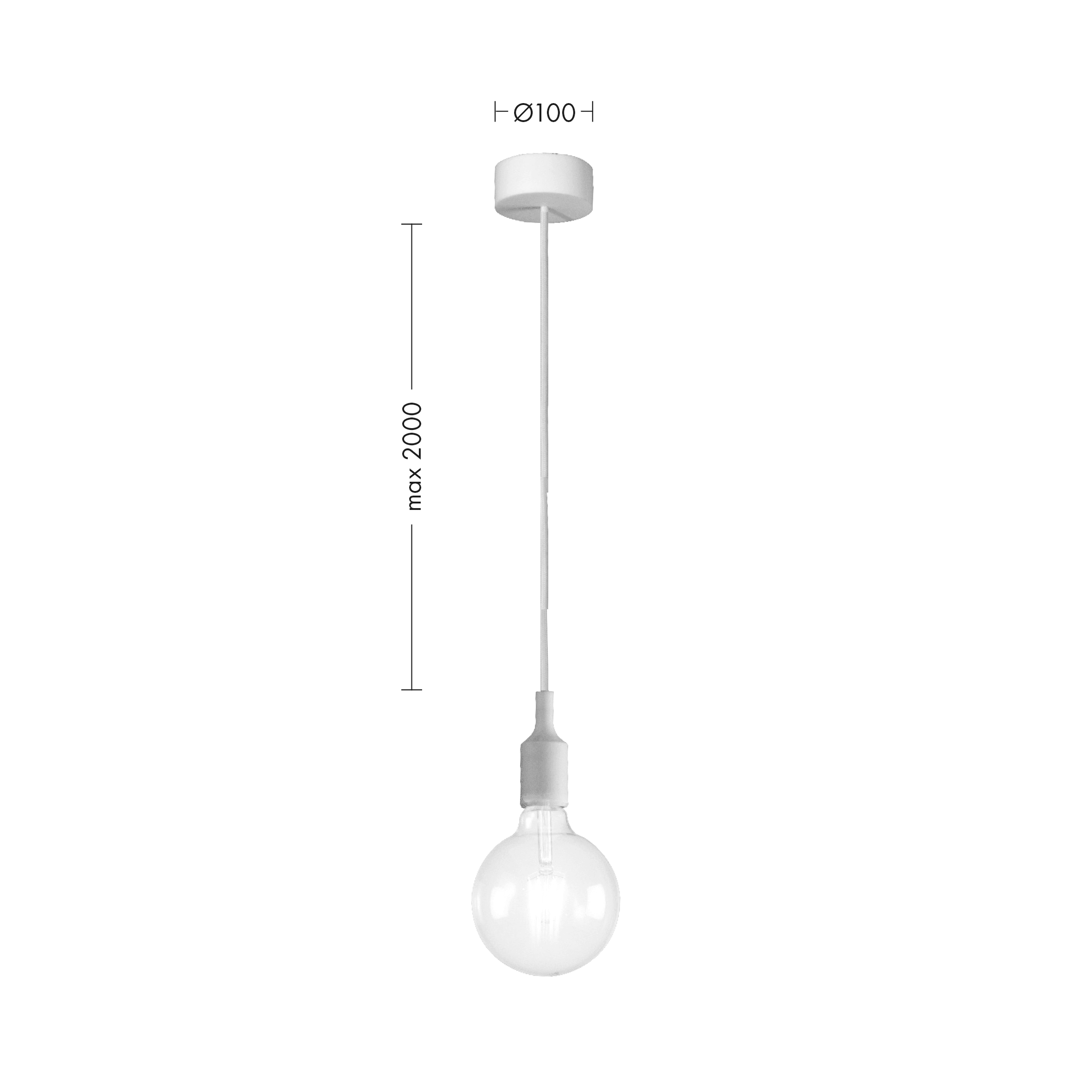 Lampada a sospensione singola con portalampada insilicone e cavo in tessuto, in tinta con la struttura e il rosone. Proposta nelle finiture bianca, nera, grigia, rossa e gialla. Attacco E27 con lampadina a vista, che consente all'utente di montare una lampadina a sua scelta, personalizzando ulterio rmente il prodotto.