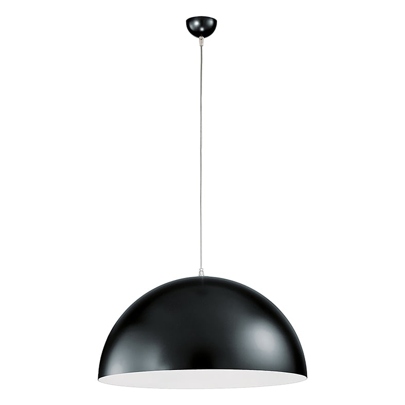 Lampada a sospensione semisfera in metallo verniciato disponibile nei colori bianco (con interno bianco) e nero (con interno bianco o oro). Particolari e rosone in tinta con il diffusore, cavo della sospensione in PVC trasparente. Attacco E27 che con sente di montare lampadina a LED.