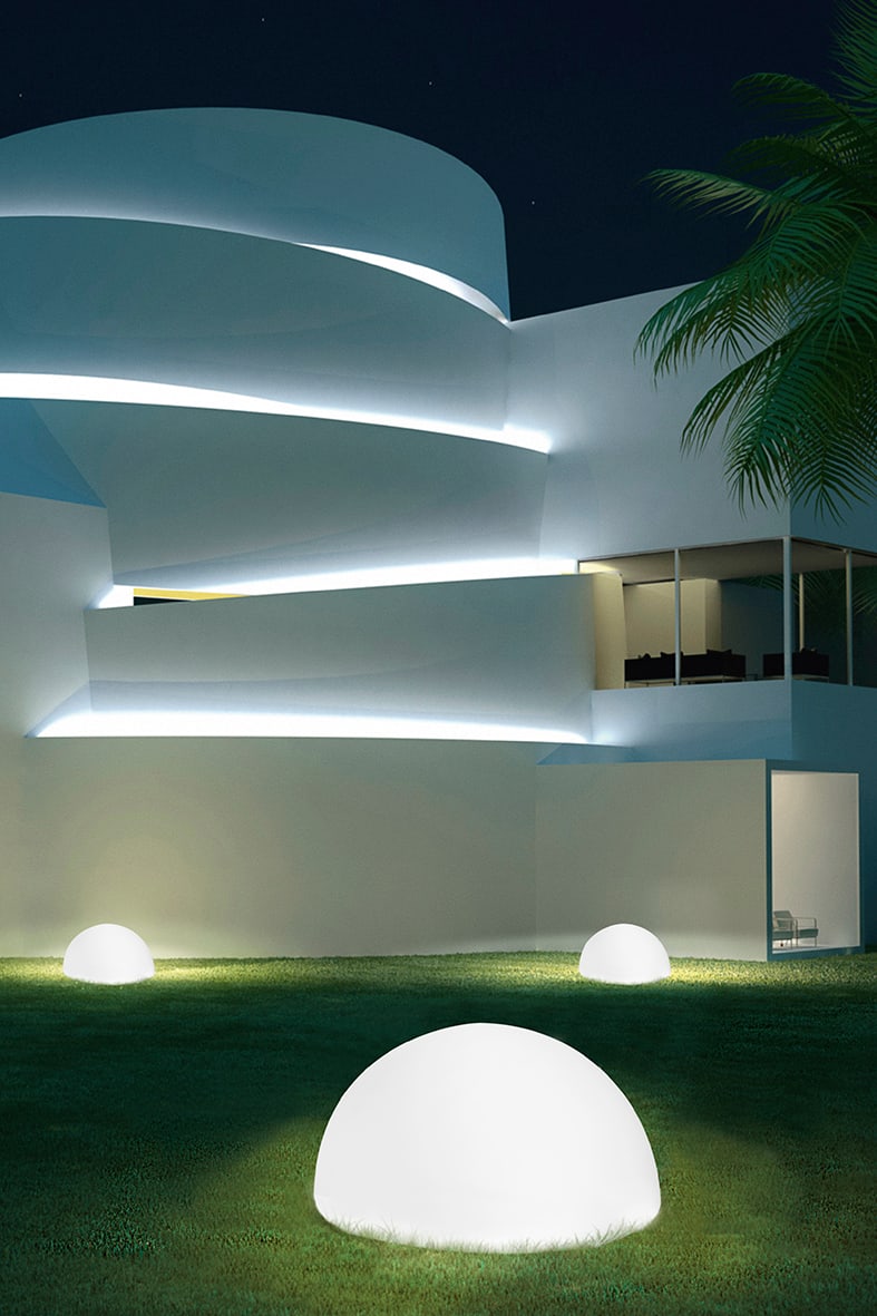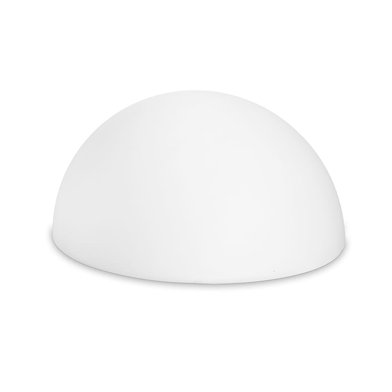 Lampada decorativa da terra per esterno (IP65), dalla forma sferica o semisferica. Corpo diffondente in polietilene con attacco E27 che consente di montare lampadina LED, per un effetto scenografico di luce diffusa. Per fissarla nel terreno ? necessario l'utilizzo dell'apposita controcassa (da ordin are come accessorio). Disponibile in tre diametri e una misura nella versione semisferica.
