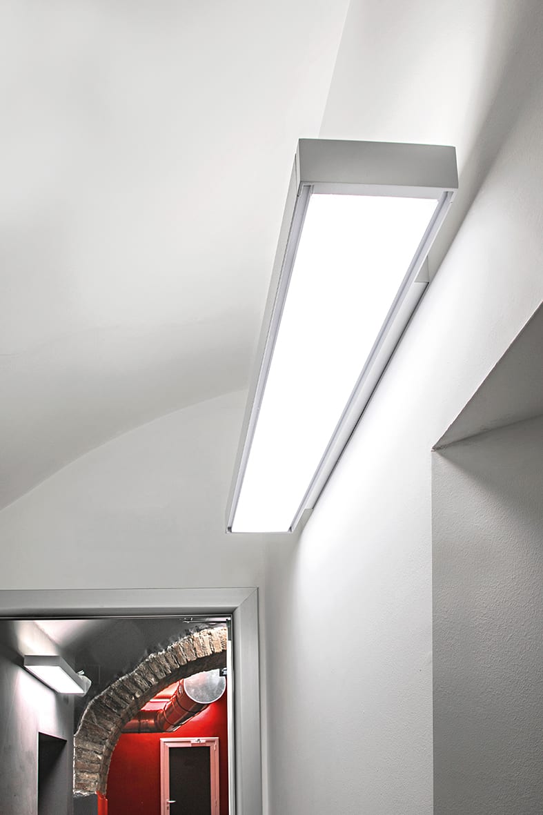 Apparecchio LED biemissione per installazione a parete. Corpo in alluminio estruso, spessore di soli 50mm, e schermi in policarbonato opale. Disponibile in due finiture (bianco e grigio) e due tempera ture colore (3000K e 4000K).