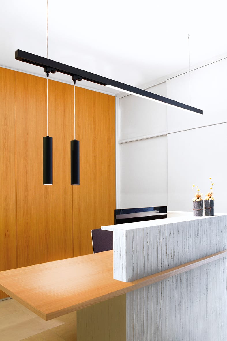 Sistema lineare LED monoemissione o biemissione, con alimentatore in remoto o a bordo, per installazione a soffitto (con kit attacco a plafone), a sospensione (con kit sospensione e rosone), o a sistema in fila continua (con giunto lineare e angolare, fino a max 1500W). Altamente versatile grazie alle molteplici combinazioni possibili date dai diff erenti moduli, il binario trifase, l'ottica opaleo antiriflesso per UGR<19 che lo rendono particolarmente adatto ad installazione in ambienti con vid eoterminali. Struttura in alluminio estruso dallaforma squadrata ed essenziale, disponibile in versione mono o doppia, verniciata con polveri epossidiche in tre finiture (bianco, nero e grigio). Disponibile in diverse misure e relative potenze, in due temperaturecolore (3000K e 4000K) e, in alcuni versioni, con sistema DALI su richiesta. Apparecchio da completare con kit testate terminali, scher mi e accessori da ordinare separatamente.