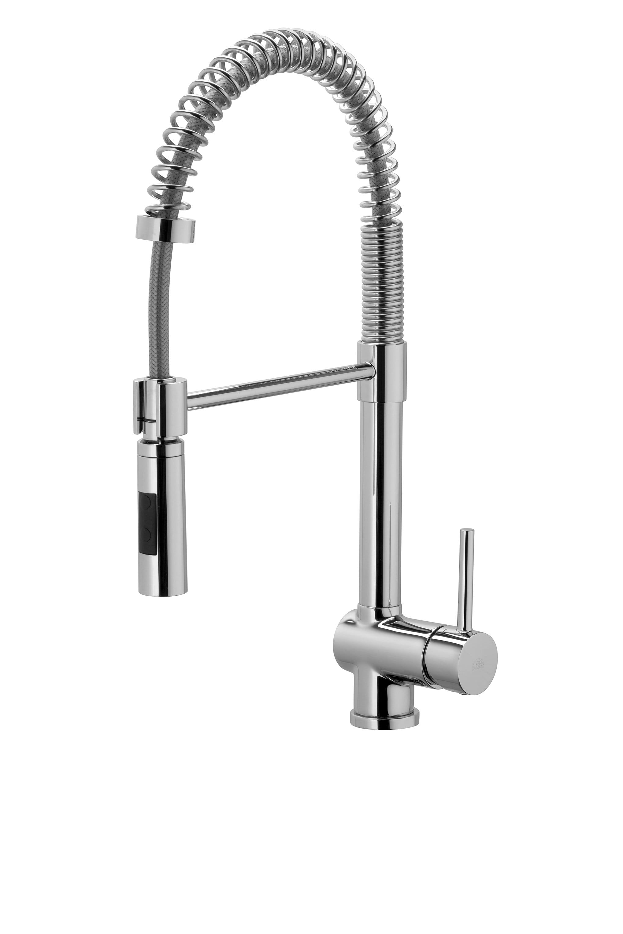 Miscelatore lavello monoforo professional con canna orientabile e con doccia Minimal (2 getti) in ABS, completo di: • set 2 flessibili inox 3/8”G. Finitura cromo