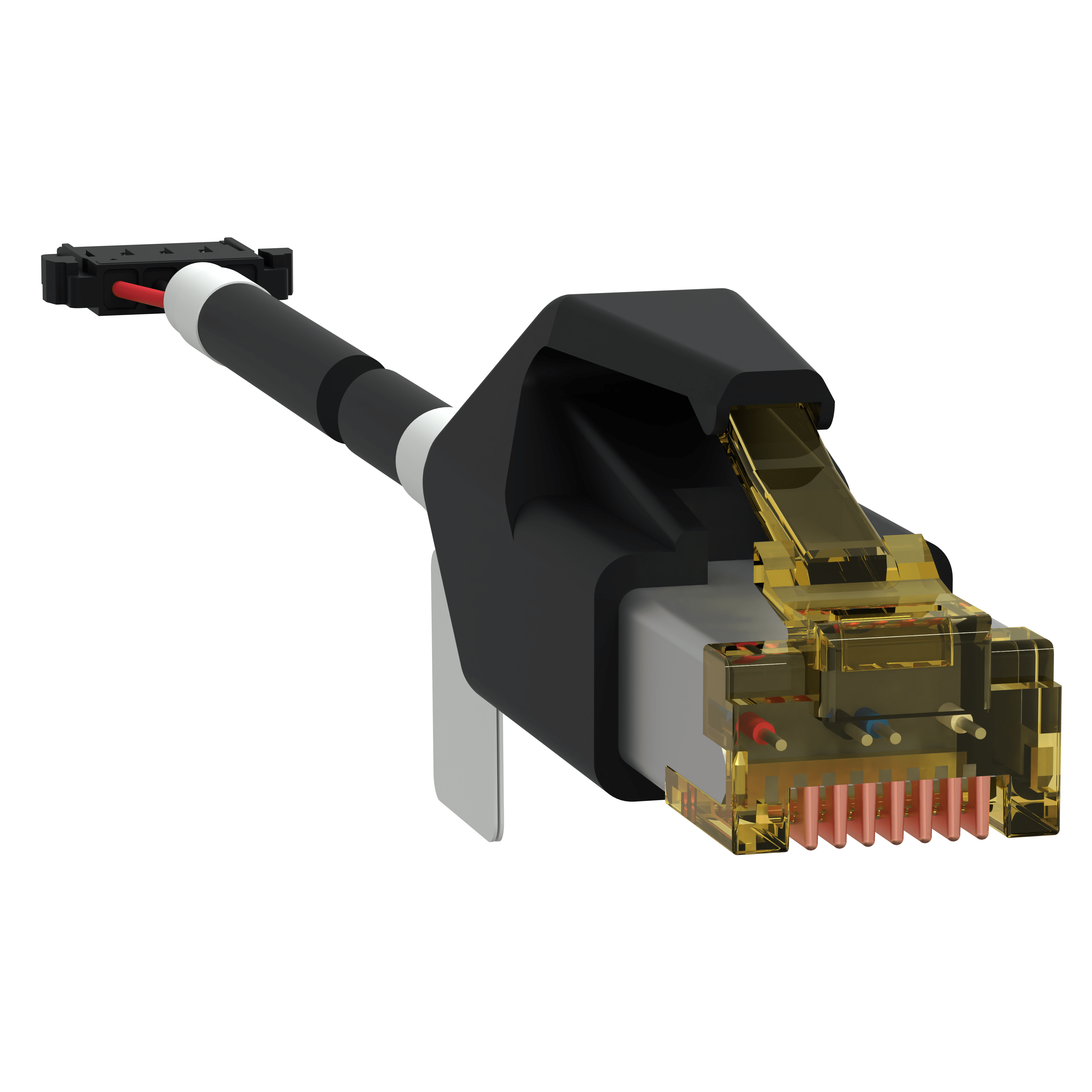 Il cavo Modbus è un accessorio per l'interruttore ComPacT NSX utilizzato per collegare il modulo BSCM Modbus SL/ ULP con l'hub Modbus. Un'estremità è dotata di interfaccia RJ45 per il collegamento all'hub Modbus, l'altra estremità si collega al connettore Modbus del modulo BSCM Modbus SL/ULP. Il cavo è dotato di una linea a coppia di fili intrecciati per i segnali a 24 V CC e Modbus. La lunghezza del cavo Modbus è di 1,3 metri.