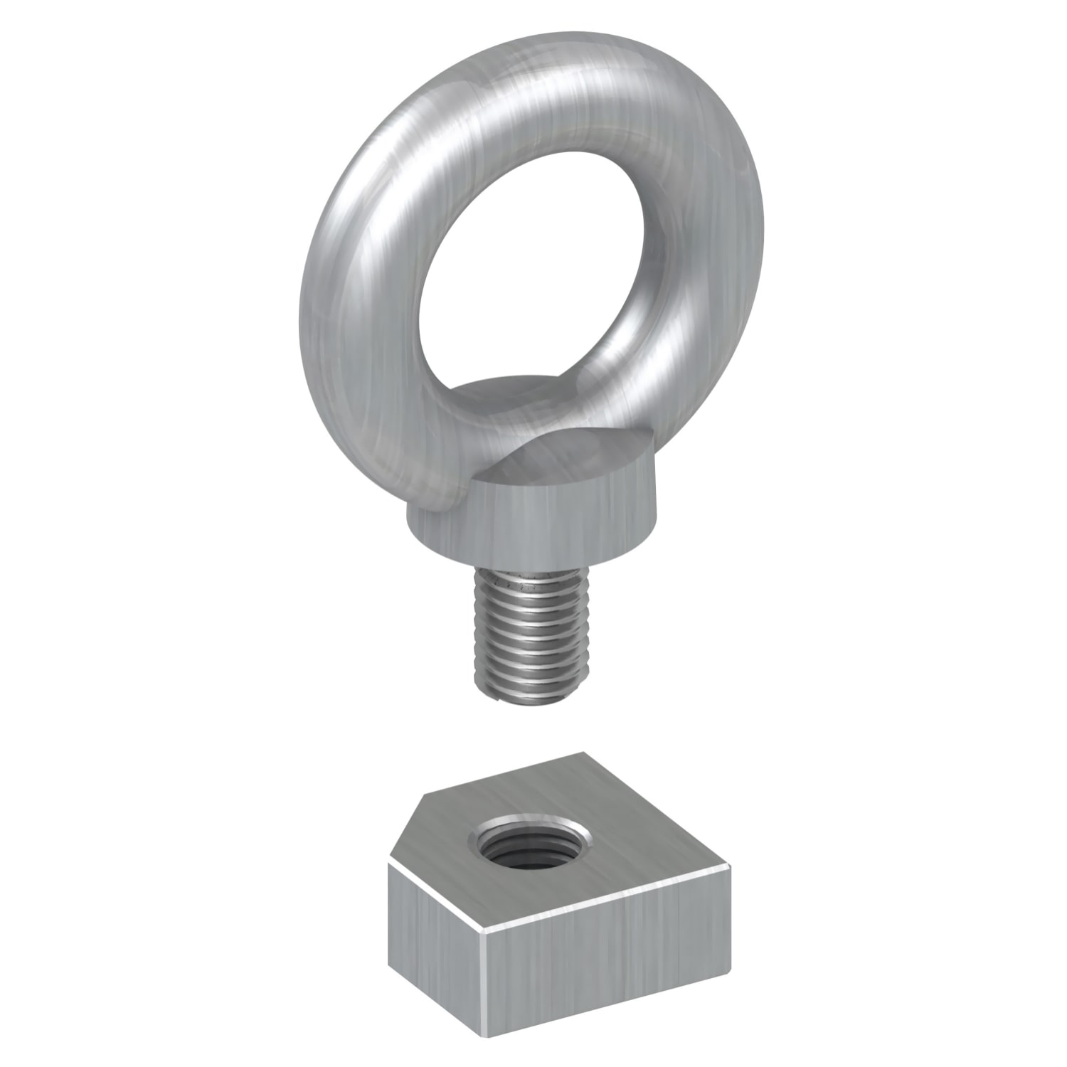 Set di golfari di sollevamento M12 per PanelSeT SF/SFM. A 61,5 x L 54 x P 26 mm. Montaggio sulla parte superiore dell'armadio. Carico permanente ammissibile 1360 kg a 60°. Acciaio pressofuso, finitura superficiale zincata. Set di 4 dadi di fissaggio e 4 golfari di sollevamento.