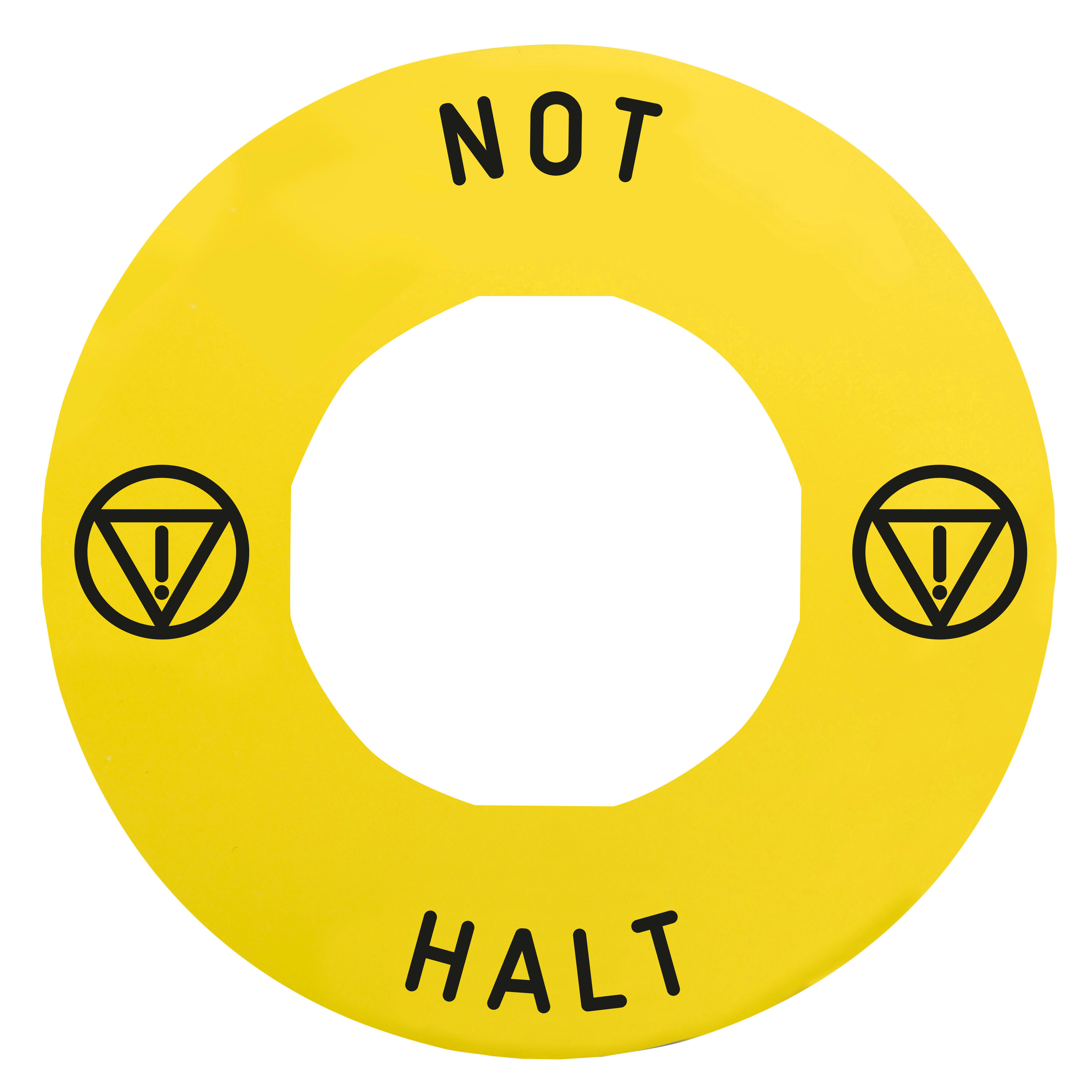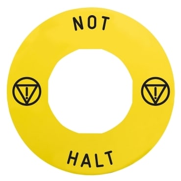 Questa etichetta circolare Harmony ZBY per la funzione di arresto d'emergenza ha uno sfondo giallo ed è contrassegnata con la scritta "NOT-HALT"e un diametro di 60 mm. È compatibile con i pulsanti e le lampade spia Harmony XB4 e XB5. Questa etichetta circolare indica chiaramente i dispositivi per l'arresto d'emergenza. Viene fornita già incisa con una marcatura relativa al funzionamento macchina ed è compatibile con qualsiasi unità standard di arresto o spegnimento d'emergenza Harmony. Fornisce una marcatura chiara e resiliente sull'etichetta, con un contrasto elevato.
