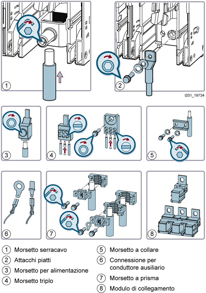 Morsetto a prisma semplice 120 - 240 mm2, per grandezza costruttiva NH2 con morsetto a vite, accessori per sezionatori sottocarico a fusibili 3NP1 contiene 3 morsetti Morsetto a prisma semplice 120 ... 240 mm² SENTRON 3NP19 come accessori per sezionatorisottocarico a fusibili 3NP1. Queste parti accessorie sono facili e comode da montare e collegare. Grazie alla protezione contro i contatti accidentali di serie, la sicurezza è garantita in modo affidabile durante linstallazione. Tecnica ottimale per la vostra sicurezza - solo da Siemens.