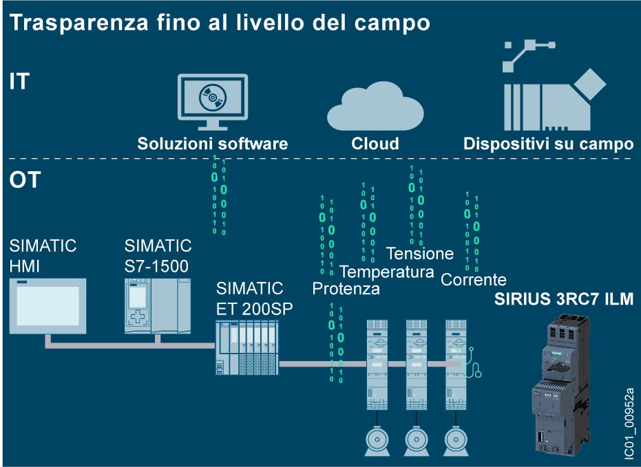 modulo Link intelligente avviatore invertitore High Feature 0,4 ... 4 A fino a AC 690 V grandezza costruttiva S00 per 3RV2.1 e 3RT2.1 per sistema ET 200SP Modulo link intelligente SIRIUS 3RC7 come estensione plug-and-play per lintegrazione di partenze motore nel sistema di automazione SIMATIC ET 200SP. Combinate il modulo di collegamento intelligente 3RC7 con i nostri contattori e interruttori automatici per realizzare una partenza motore intelligente. Essendo un componente del comprovato concetto di automazione Totally Integrated Automation (TIA) di Siemens, esso è perfettamente integrato nellambiente di automazione esistente. Il rilevamento diretto di valori di misura e informazioni di stato consente la trasparenza fino nel livello di campo. La funzione di sovraccarico integrata e il riconoscimento di guasti, deviazioni e manutenzione necessaria facilitano la diagnostica e consentono una manutenzione preventiva. La notevole riduzione dellonere di cablaggio, la semplicità di montaggio nel quadro elettrico e la parametrizzazione in TIA Portal consentono di risparmiare tempo durante la messa in servizio e gli ampliamenti. I moduli di collegamento intelligente 3RC7 sono disponibili per avviatori diretti e avviatori invertitori per diversi campi di corrente, come varianti sia Standard che High Feature e tra laltro con misura della tensione e della potenza. Come accessori sono disponibili ad es. adattatori per montaggio separato, Power Cable e Communication Cable. Moduli di collegamento intelligenti 3RC7 - Semplicemente digitali. Intelligenti sotto vari aspetti.