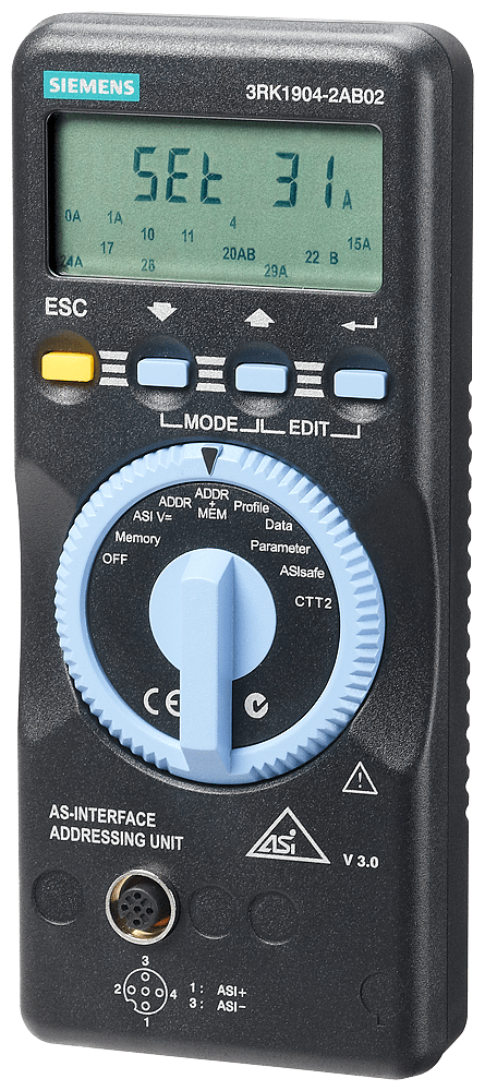 AS-Interface dispositivo di indirizzamento V3.0 per limpostazione degli indirizzi di moduli slave AS-i test di ingressi/uscite e altre funzioni specifica AS-i V3.0 presa di collegamento M12 con cavo di indirizzamento 1,5 m (connettore M12 / connettore a barilotto) con batterie (4 x 1,5 V LR6) AS-Interface - lo standard di bus di campo intelligente.