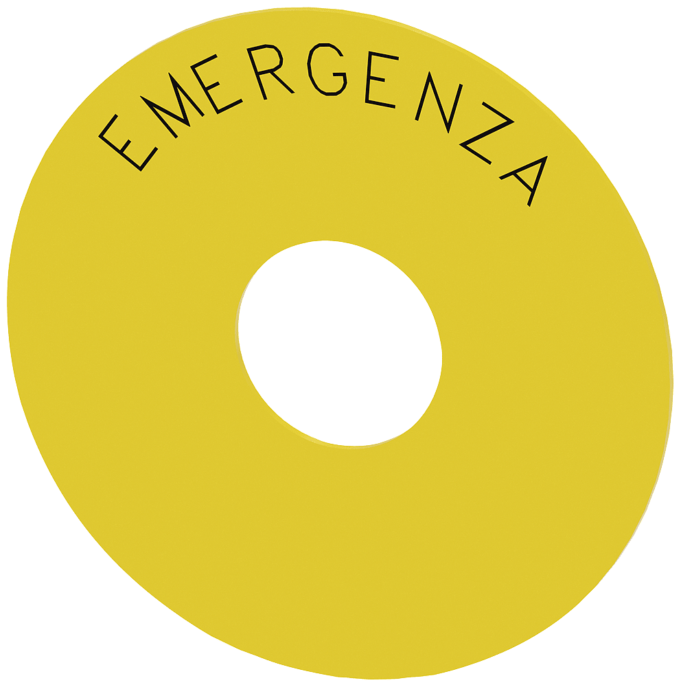 targhetta con dicitura rotonda, per pulsante a fungo di ARRESTO DI EMERGENZA, giallo, autoadesivo, diametro esterno 75 mm, diametro interno 23 mm, con iscrizione: EMERGENZA Targhetta rotonda per ARRESTO DI EMERGENZA per la siglatura dei dispositivi di comando e segnalazione SIRIUS ACT. Siemens offre, sotto il nome commerciale SIRIUS ACT, un portfolio esclusivo di dispositivi di comando e segnalazione con omologazioni di prodotto per il mercato mondiale in tre moderne serie di design in robusto metallo puro e plastica pregiata.Linnovativo concetto di innesto a scatto semplifica talmente il montaggio che per eseguirlo basta una sola mano e non servono attrezzi speciali. Per i fori di montaggio sono sufficienti semplici fori non scanalati, essendo già integrata una protezione antirotazione al 100 %.Grazie al grado di protezione elevato i robusti apparecchi sono adatti allimpiego industriale e in ambiente esterno. È persino possibile la pulizia con getto ad alta pressione. Né polvere, né oli, né liscivia possono comprometterne il funzionamento affidabile.Oltre che con il cablaggio standard, gli apparecchi possono essere collegati al controllore anche tramite PROFINET, AS-Interface oppure IO-Link. Potete così ridurre il vostro onere di cablaggio, minimizzare le fonti di errore e ottenere maggiore flessibilità.Il configuratore online grafico supporta in modo confortevole la scelta e lordinazione di singoli apparecchi, pulsantiere e iscrizioni. È disponibile una documentazione completa (ad es. manuale, dati 3D,schema di collegamento). Ampia gamma di accessori opzionali (ad es. targhette identificative, per protezione e accesso, operatori, accessori per pulsantiere). SIRIUS ACT - Performance in Action nel comando e nella segnalazione. Semplici da montare, altamente performanti, semplicemente perfetti.