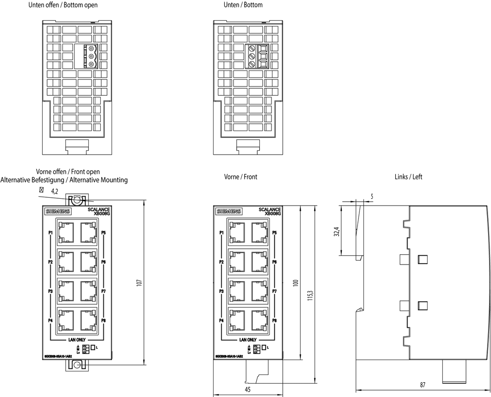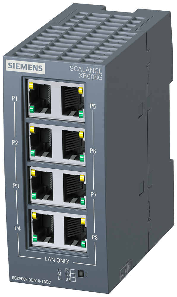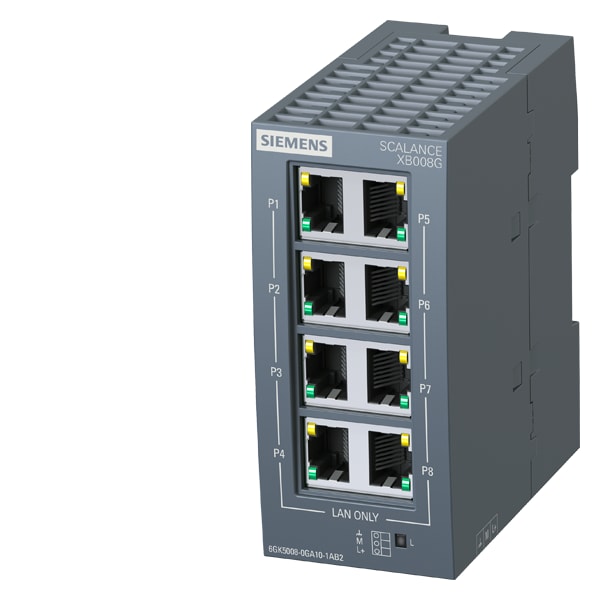 SCALANCE XB008G unmanaged Industrial Ethernet Switch per 10/100/1000 Mbit/s; per la configurazione di piccole strutture a stella e strutture lineari; diagnostica LED, IP20, DC 24 V alimentazione di tensione, con 8x porte RJ45 da 10/100/1000 Mbit/s elettrico manuale disponibile come download . SCALANCE XB008G unmanaged switch compatto, 8x RJ45 da 10/100/1000 Mbit/s per piccole reti IE. Funzionali, compatti e adatti alluso industriale: gli switch SCALANCE XB008G offrono sempre lo switch Compact Ethernet giusto per garantire una semplice interconnessione di macchine in rete. Grazie a varianti che possono avere da 5 a 8 porte è possibile realizzare senza problemi anche trasmissioni dati nellordine dei gigabit. I Compact Switch Module (CSM) permettono di realizzare un collegamento economico ai controllori SIMATIC e quindi lintegrazione delle macchine negli impianti esistenti. Con i nostri switch unmanaged e CSM robusti e facili da utilizzare, è possibile creare reti Industrial Ethernet a costi vantaggiosi.