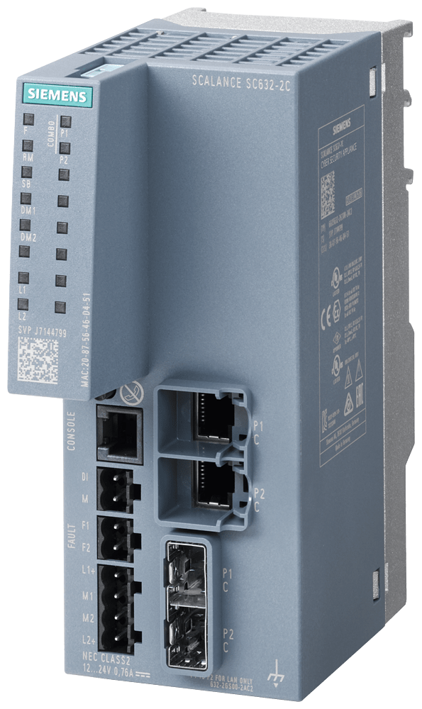 SCALANCE SC632-2C Industrial Security Appliance; per la protezione di apparecchi e reti nella produzione discreta e nellindustria di processo per la sicurezza della comunicazione industriale con firewall; ulteriori funzioni: conversione di indirizzo (NAT/NAPT); collegamento a SINEMA RC; 2x porte Combo elettriche oppure ottiche; 10/100/1000 Mbit/s RJ45 o 100 Mbit/s SFP oppure 1000 Mbit/s SFP. SCALANCE SC632-2C 2x porte combo elettriche o ottiche, velocità di trasmissione 10/100/1000 Mbit/s con porta RJ45 o 100 Mbit/s con porta SFP o 1000 Mbit/s con porta SFP, conversione dindirizzo (NAT/NAPT), collegamento a SINEMA RC. Per la protezione di apparecchiature e reti nella produzione discreta e nellindustria di processo, e per la protezione della comunicazioneindustriale tramite firewall. SCALANCE S è perfettamente adatto allimpiego nellambiente di automazione e/o nel campo industriale e soddisfa le speciali esigenze della tecnica di automazione come ad es. il semplice upgrade di impianti esistenti, la facileinstallabilità o i minimi tempi di fermo in caso di guasto. Protezione di reti di automazione industriali da accessi non autorizzati e realizzazione di una DMZ (area protetta). Possibilità di scambio dati con altre reti senza dovere concedere laccesso diretto alla rete dellimpianto di produzione. Controllo e filtraggio del traffico dati grazie a firewall integrati e pertanto protezione contro operazioni errate, impedimento di accessi non autorizzati, prevenzione di guasti e sovraccarico di comunicazione.Integrazione senza problemi in reti già esistenti senza riconfigurazione di nodi terminali o realizzazione di nuove sottoreti IP. Protezione completa grazie a un concetto di protezione flessibile della cella. Gli apparecchi sono robusti e realizzati per limpiego industriale. Fanno parte degli accessori tra laltro unampia gamma di software, supporti di memoria rimovibili, connettori FastConnect, attrezzi spelafili, transceiver a innesto e cavi che completano perfettamente il sistema.