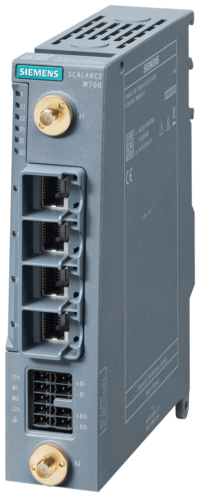 IWLAN Client, con DI/DO SCALANCE WUM763-1, 1 interfaccia radio, 2,4/5 GHz, 2 collegamenti R-SMA, supporto iFeature via CLP, IEEE 802.11ax (Wi-Fi 6), 1201 Mbit/s (lordo), 4x porte RJ45 da 10/100/1000 Mbit/s, DC 24 V ridondante, blocco morsetti, IP30, -30 ... +60 °C, slot per CLP, DI/DO, blocco morsetti osservare le omologazioni nazionali! ID-Cert: MSAX-W1-RJ-E2 FCC ID: LYHMSAXV1 funzionamento al di fuori di USA/Israele dotazione di fornitura: copertura posto connettore CLP, coperture collegamenti dantenna, 3x blocco morsetti DI/DO SCALANCE WUM763-1, 1x interfaccia radio, 2x collegamenti per antenne R-SMA, supporto iFeatures tramite CLP, IEEE 802.11ax (Wi-Fi 6), 2,4/5 GHz, data rate lordo 1201 Mbit/s, 4x porte RJ45 da 10/100/1000 Mbit/s, DC 24 V ridondante, blocco morsetti, IP30, slot per CLP, per il funzionamento fuori da USA/Israele. Per la gestione del collegamento radio con funzioni sviluppate appositamente per lindustria (PCF/PCF-MC) di unapparecchiatura collegata con connessione Industrial Ethernet. 1 pezzo. Le apparecchiature sono adatte sia per limpiego nel quadro elettrico sia senza quadro elettrico in ambiente interno. Mediante funzioni sviluppate appositamente per lindustria è possibile una comunicazione wireless sicura tramite PROFINET con PROFIsafe fino a 150 Mbit/s. Integrazione di impianti industriali in infrastrutture WLAN, sostituzione economicamente vantaggiosa di linee cavi, forma costruttiva leggera e compatta per limpiego efficiente su sistemi di trasporto automatici (AGV). Dimensioni compatte e salvaspazio per il montaggio nel quadro elettrico. Particolarmente a prova di futuro grazie alla conformità con lo standard WLAN IEEE 802.11 riconosciuto a livello mondiale. Traffico dati prevedibile (funzionamento deterministico) e tempi di risposta definiti sul canale radio. Comunicazione PROFINET per requisiti di real-time e ridondanza, nonché trasmissione dei dati rilevanti per la sicurezza tramite PROFIsafe. Semplicità di gestione tramite Web Server e SNMP. Inoltre risparmio di costi utilizzando una unica reteradio. Della gamma completa di accessori fanno parte un ampio portfolio di antenne, connettori, attrezzo spelafili, accessori di montaggio e di tecnica di cablaggio che completano il sistema.