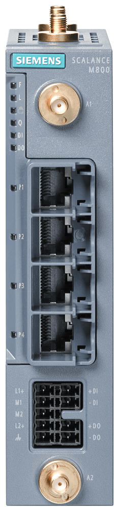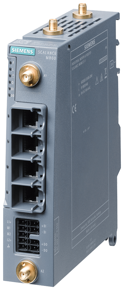 SCALANCE MUM853-1 (A1) 5G- Router, rel.16, IP30, per la comunicazione IP wireless di applicazioni basate su Ethernet tramite reti radio pubbliche 3/4/5G e reti 5G private, VPN, firewall, NAT, IPv6, collegamento a SINEMA RC via CLP, 4 collegamenti SMA , 1x Micro SIM slot, eSIM, 4x porte 10/100/1000 Mbit/s RJ45, ridondante DC 24V, -30… +60°C, slot per CLP, 1x DI e 1x DO, osservare le omologazioni nazionali!: siemens.com/mobile-approvals ID cert.: MS5G16R-30-M1-RJ-E4-1 SCALANCE MUM853-1, router 5G (A1), IP30, per la comunicazione IP wireless di applicazioni basate su Ethernet tramite reti mobili pubbliche 3/4/5G e reti private 5G, VPN, firewall, NAT, IPv6, collegamento a SINEMA RC tramite CLP, 4 connessioni SMA, 1x slot per Micro SIM, 4x porte RJ45 da 10/100/1000 Mbit/s, DC 24 V ridondante, -30 … +60 °C, slot per CLP, 1x DI e 1x DO, osservare le omologazioni nazionali!