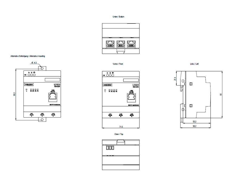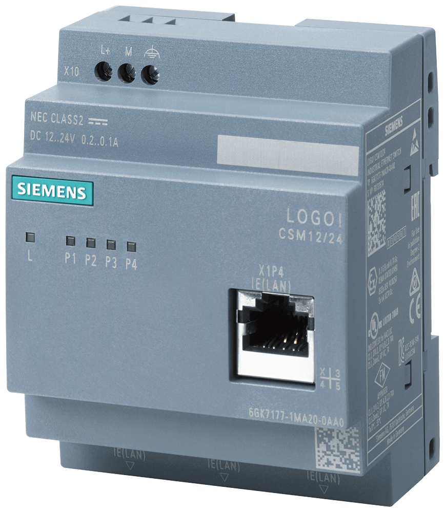 LOGO! CSM12/24 Compact Switch modulo collegamento di ununità LOGO! (. ..0BA7/...0BA8) e di fino a 3 ulteriori nodi a Industrial Ethernet con 10/100 MBit/s switch unmanaged, 4 porte RJ45 1x porta frontale per la diagnostica DC alimentazione di tensione 12/24V diagnostica LED, configurazione LOGO! SCALANCE LOGO! Modulo switch compatto CSM 12/24, switch unmanaged, 4x RJ45 da 10/100 Mbit/s, 1x porta frontale per il collegamento di un LOGO! a IE. Realizzazione di piccole reti Ethernet locali. La realizzazioneeconomica di piccole reti Industrial Ethernet locali consente di risparmiare sui costi di montaggio e sullo spazio di installazione rispetto alluso di un componente di rete esterno. Possibilità di ampliamento flessibile della rete grazie al semplice inserimento del CSM. Messa in servizio rapida, poiché non è necessaria alcuna progettazione, nonché accesso veloce e senza complicazioni alla diagnostica nel quadro elettrico. Supporto dellimpiego stand-alone come switch unmanaged a 4 porte per linterconnessione in rete di qualsiasi apparecchiatura Ethernet. LED per la diagnostica e la visualizzazione di stato delle porte Industrial Ethernet. Compact Switch Module per il collegamento di un LOGO! e di fino a 3 ulteriori nodi a Industrial Ethernet con unmanagedswitch 10/100 Mbit/s, 4x porte RJ45, 1x porta frontale per diagnostica, DC 12/24V. Il sistema è completato da un IE FC Outlet RJ45 e diverse varianti di cavi di collegamento.
